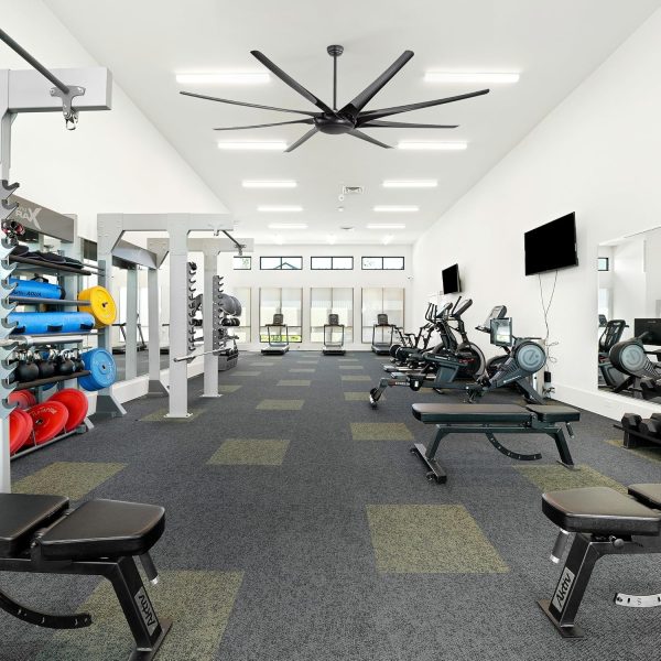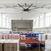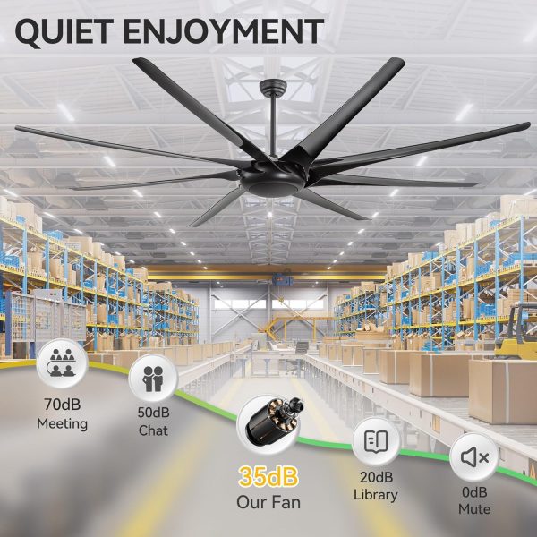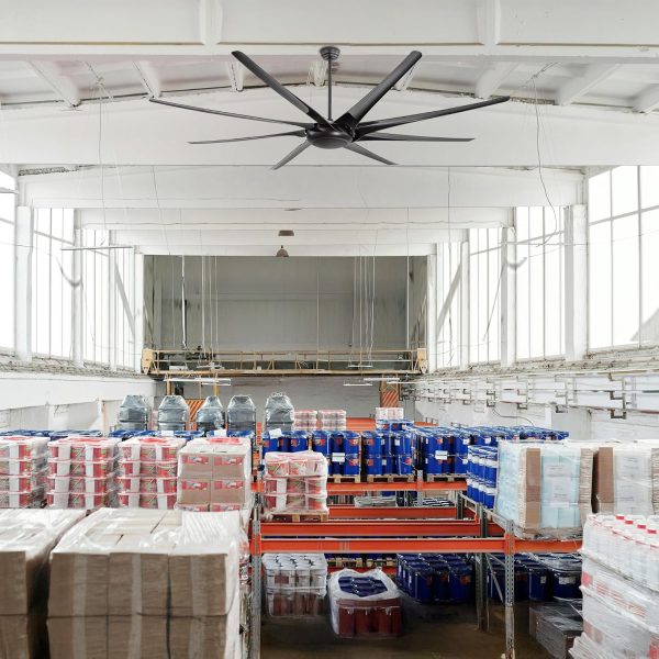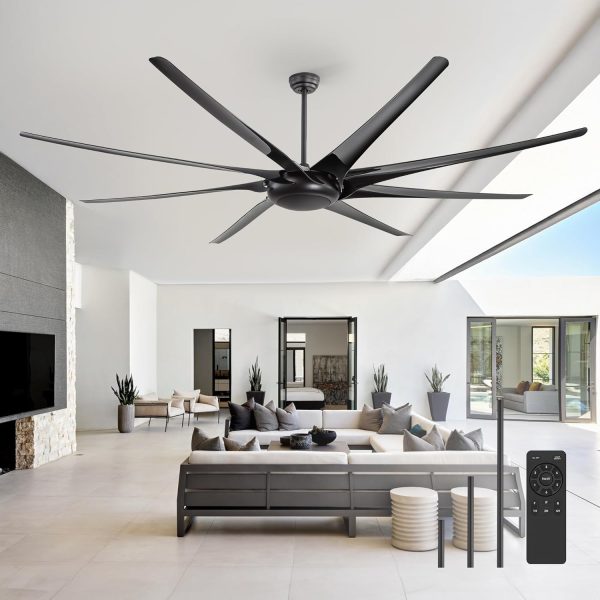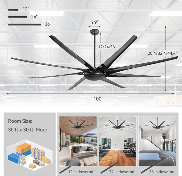 100 Inch Modern Industrial HVLS Ceiling Fan: This large fan features a matte black body with 8 ABS blades, blending modern and industrial style. Designed for efficient HVLS air circulation, it comes with 12", 24", and 36" downrods and delivers powerful airflow for shops, living rooms, libraries, garages, barns, or covered patios
