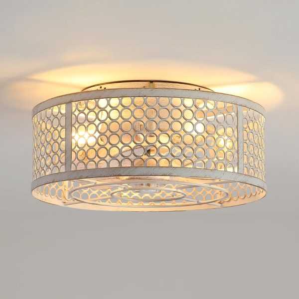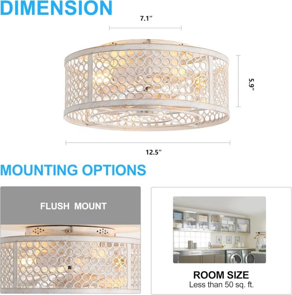 12.5 Inch Flush Mount Caged Ceiling Fan with Light and Remote, DC Motor, 6-Speed, Timer, Modern Low Profile Enclosed Ceiling Fan for Bedroom, Bulbs Not Included (Vintage Distressed White)