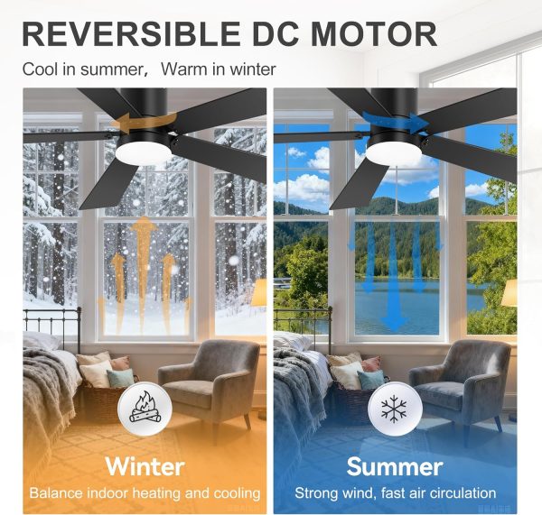 6 Wind Speed Reversible DC Motor With super silent DC motor, this 42 inch industrial low profile ceiling fans with light runs smoothly with lower noise under 30db and deliver strong airflow. 5 reversible blades provide downward wind to keep your room cool in summer, while in winter, you can change it to upward to enhance the airflow and keep your room warm.