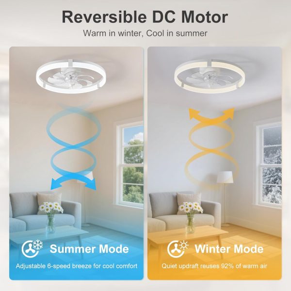 • Reversible DC Motor & Quiet Fan This flush mount ceiling fan supports two airflow modes: downdraft for summer cooling and updraft for winter circulation. The copper DC motor runs smoothly, delivering efficient and quiet airflow.