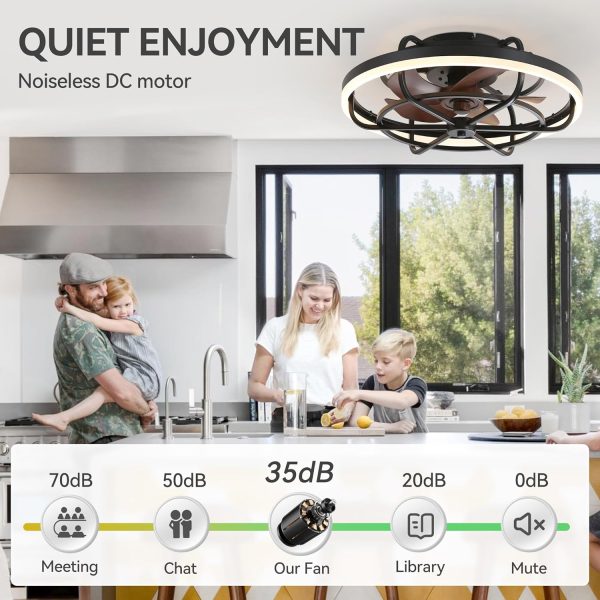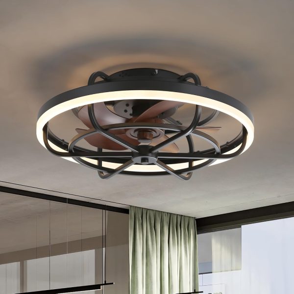 • Modern Caged Ceiling Fan Light This 20" modern bladeless ceiling fans with led light can be set with either upward or downward rotation modes by slide the switch on the fan body easily. Set downward rotation in summer to keep your room cool while upward in winter to enhance air circulation and keep warm. With high quality DC motor, this ceiling fan runs smoothly and quietly, with low noise under 30db.