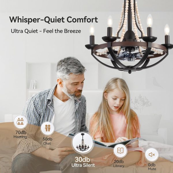 • Unique Vintage Cage Chandelier Design: This 22-inch ceiling fan combines a classic retro cage structure with an elegant chandelier style. It features 6 E12 bulb bases (max 10W each) for warm ambient lighting, perfect for creating a cozy and unique atmosphere. The iron shade and metal frame ensure durability, making it a stunning decorative piece for any room.