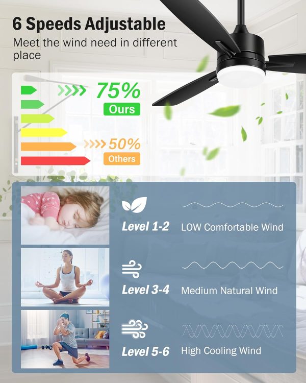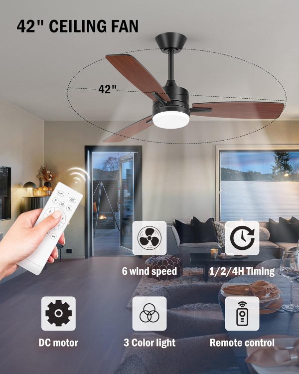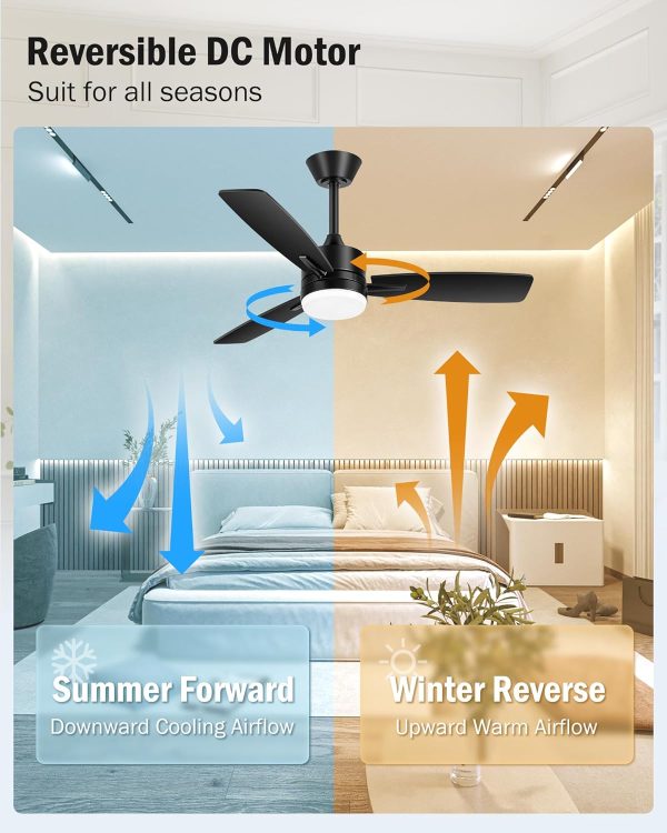 Multi-Speed Reversible Quiet DC Motor The 42 Inch Black Ceiling Fans with Lights Led and Remote Control has a multi-speed reversible quiet DC motor. In the summer,the forward mode allows air to flow downward and keep you cool.Less than 30 decibels of sound for a comfortable sleeping environment.In the winter,the reverse mode allows air to flow upward so that the warm air produced by the room's heating equipment is evenly distributed throughout the room.It has six adjustable wind speeds.