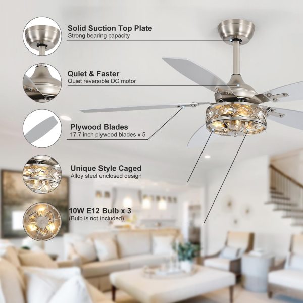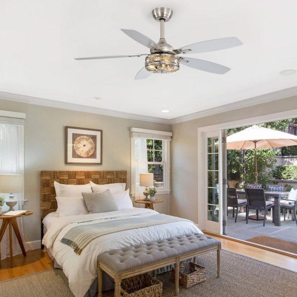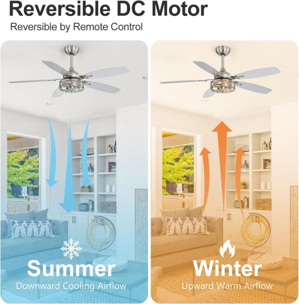 • 48 Inch Modern Ceiling Fan: Equipped with energy-efficient DC motor, this 48 inch ceiling fans with a decorative caged 3-light fixture, runs smoothly with no noise and deliver strong airflow. Reversible 5-blade design provides cooling downdraft in summer and warm air circulation in winter, reducing energy costs year-round.