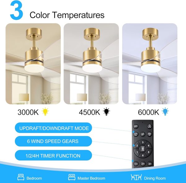 Multi-Function Remote Control: With the remote controller included, you can set the color temperature and the fan speed of this gold ceiling fans easily to a cozy mode. The fan and the light can be controlled separately. 6 wind speed gears and 3 color temperatures for choice. Range: warm white light(3000K), natural light(4000K) and cold white light(6000K). In addition, 1 Hour, 2 Hour and 4 Hour can be choosen when you use the timing function.