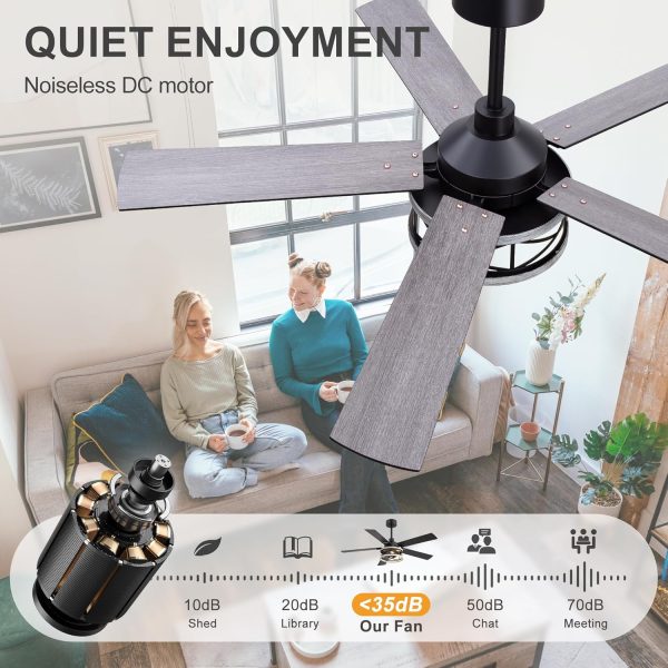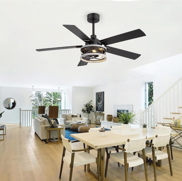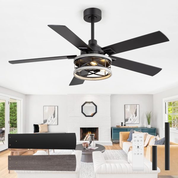 Industrial Farmhouse Style: This 52" ceiling fan pairs an iron cage light with 5 reversible plywood bladesblack on one side, gray wood grain on the other. The dual-finish design lets you switch between modern and farmhouse looks, perfect for living rooms, bedrooms, dining areas, kitchens, or covered patios