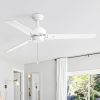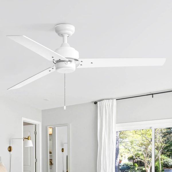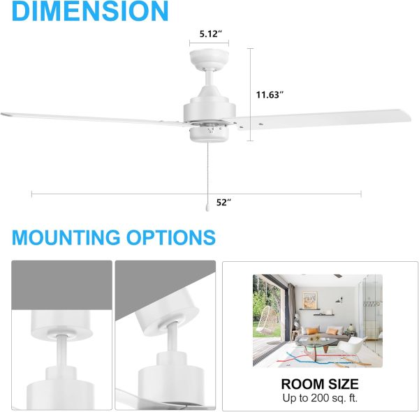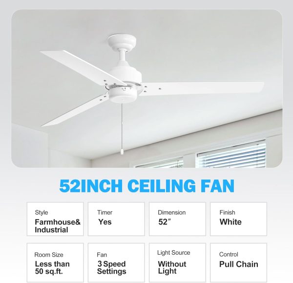 52 Inch; Ceiling Fans without Light Pull Chain, 3-Blade, Quiet Reversible AC Motor, 3-Speed, Down Rod Mount, Industrial Low Profile Ceiling Fan with No Light for Home Office Kitchen, White