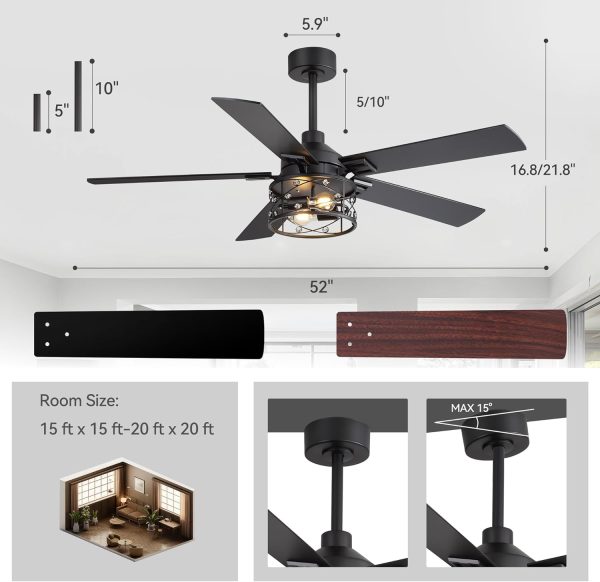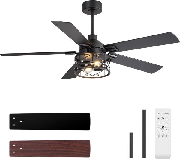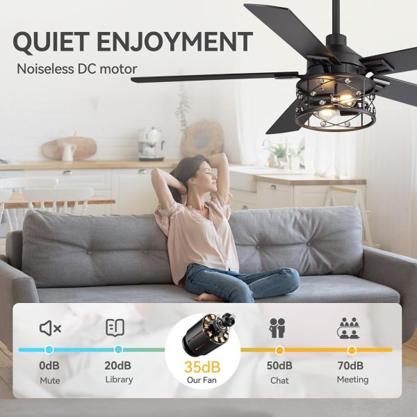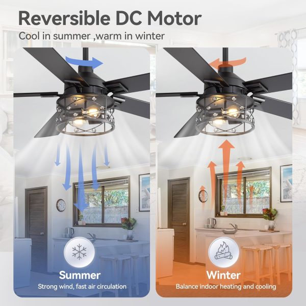 Modern Ceiling Fan with Caged Light Upgrade your space with our 52-Inch matte black farmhouse ceiling fan caged chandelier, this modern ceiling fan combines powerful performance with modern aesthetics. Featuring 5 durable plywood blades, it delivers optimal airflow while maintaining quiet operation. The reversible DC motor ensures energy efficiency, allowing you to enjoy comfort year-round.