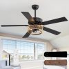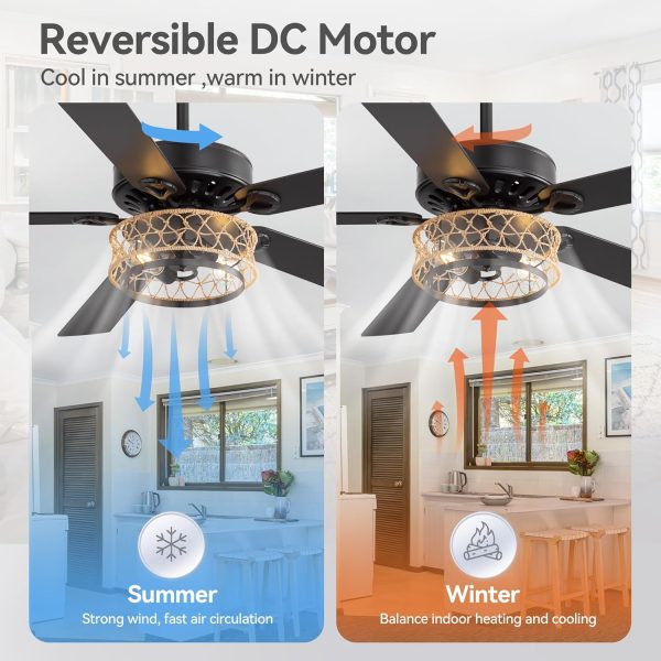 Traditional Ceiling Fan with Ratten Caged Light Upgrade your space with our 52-Inch boho ceiling fan with metal cage wrapped in hemp rope, this modern ceiling fan combines powerful performance with modern aesthetics. Featuring 5 durable plywood blades, it delivers optimal airflow while maintaining quiet operation. The reversible DC motor ensures energy efficiency, allowing you to enjoy comfort year-round.