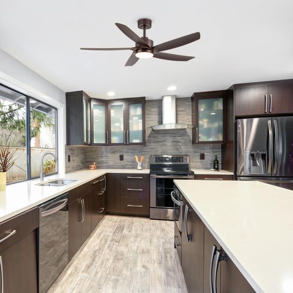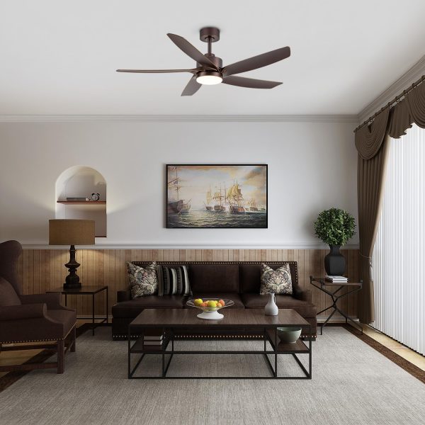 • Rustic Modern Design Oil-rubbed bronze finish with matte gold accents and 5 distressed wood-look blades. Features an integrated frosted acrylic light shade for glare-free illumination.