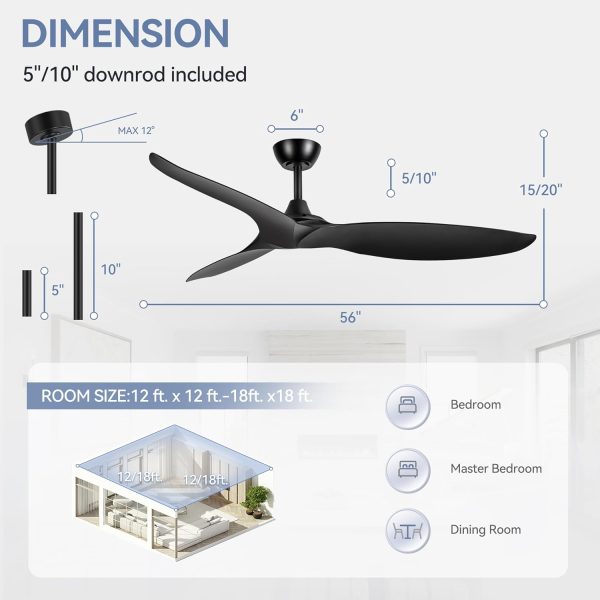 Widely Applications This 56 Inch modern black ceiling fans with no light is extra large and enough for large rooms up to 350-500 sq. fit such as outdoor patio, garage, farmhouse, indoor living room, dinning room, bedroom, office, shop, studio, bar etc. It is designed to meet the demands of larger space.