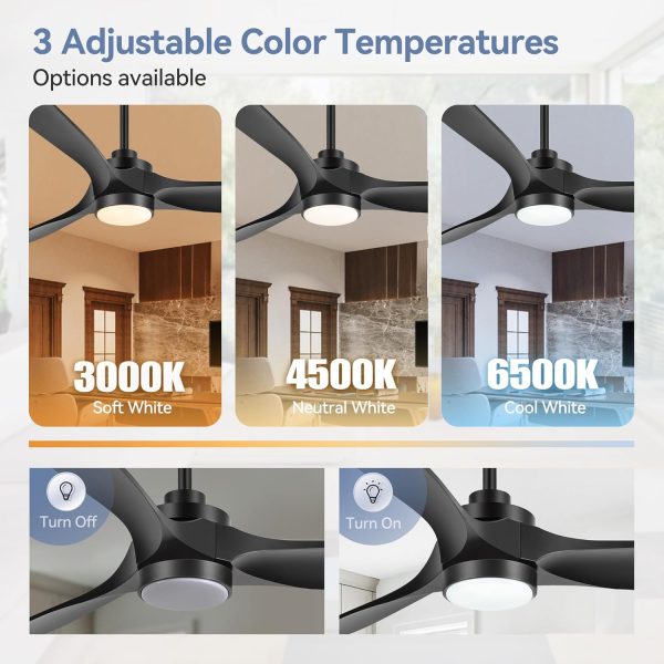 Industrial Black Ceiling Fan Remote Control With the remote control included, you can set the the fan speed of this modern low profile ceiling fans easily to a cozy mode. 6 wind speed for choice. 3 color temperature(3000K, 4500K, 6000K), 1H, 2H, 4H timer function, and reverse function.
