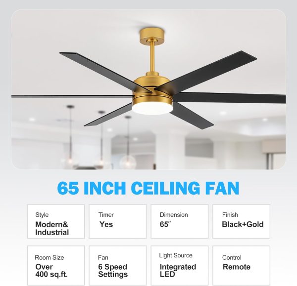 Large Ceiling Fan & Widely Applications This 65" black and gold ceiling fan with led lights is extra large and enough for large rooms up to 450 sq. fit such as outdoor patio, garage, farmhouse, living room, dinning room, bedroom, office, shop, studio, bar etc. It is designed to meet the demands of larger space.