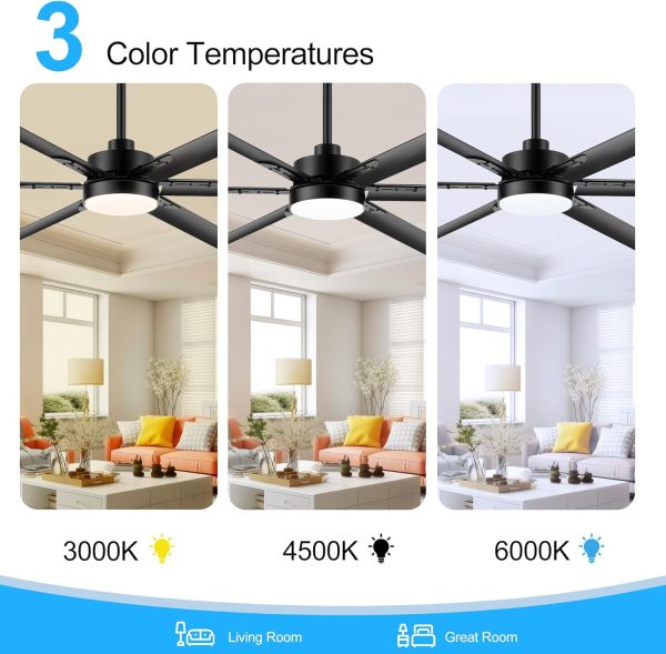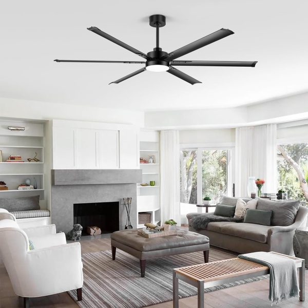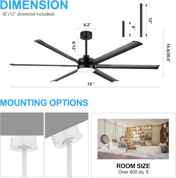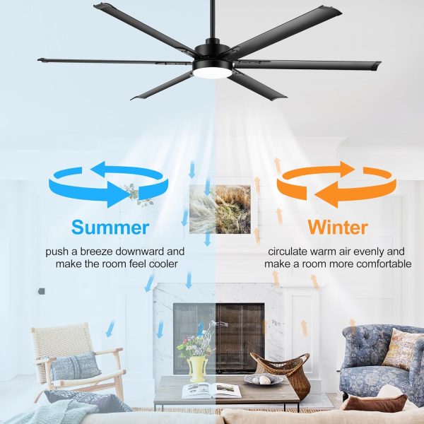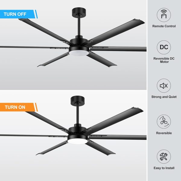 6 Reversible Blade & Quiet DC Motor: With super silent DC motor, this 72 inch industrial black ceiling fans with led lights runs smoothly with no noise and deliver strong airflow. 6 reversible aluminum blades provide downward wind to keep your room cool in summer, while in winter, you can change it to upward to enhance the airflow and keep your room warm.