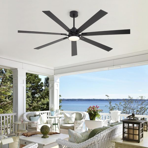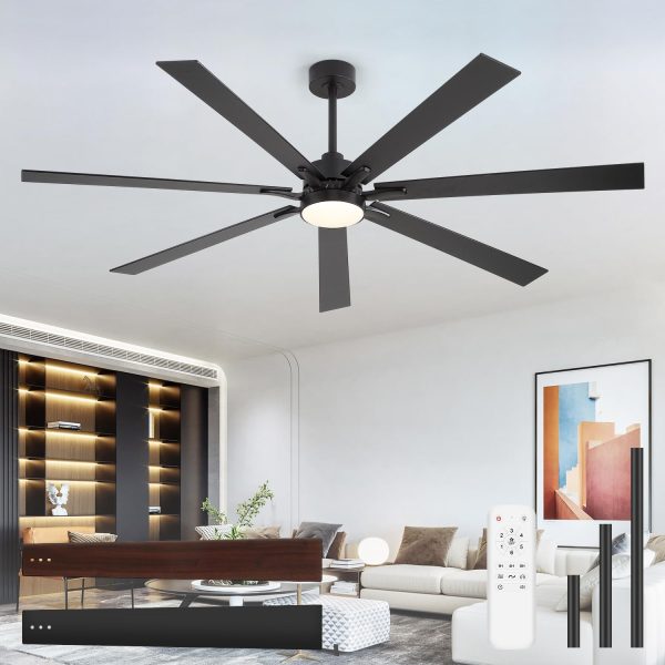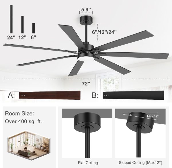 72 Inch Modern Ceiling Fan This large fan includes 6", 12", and 24" downrods for ceilings of different heights. Its 7 reversible dual-finish blades combine modern, farmhouse, and industrial styles. Compatible with slopes up to 12, its ideal for living rooms, garages, barns, and covered patios