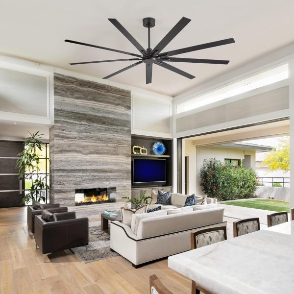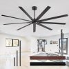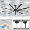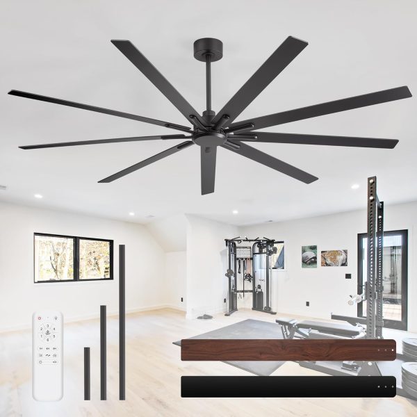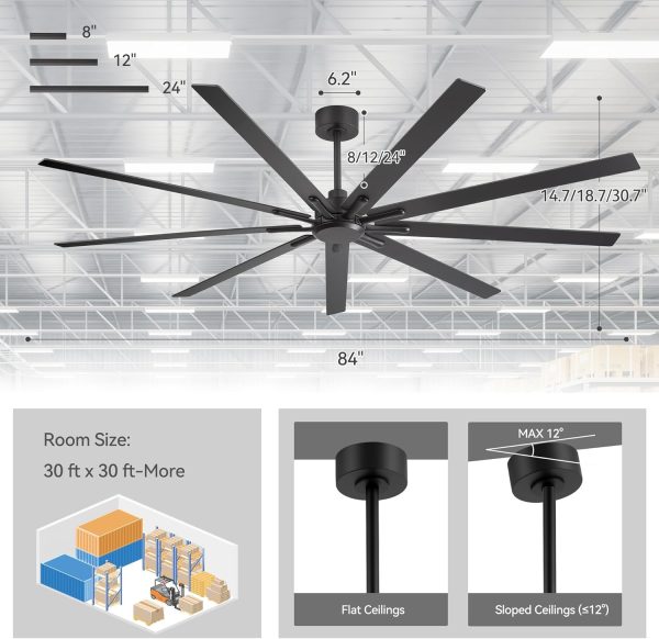 84 Inch Modern Industrial Ceiling Fan: This large fan features a sleek black body and 9 plywood blades for modern or rustic spaces. It includes 8", 12", and 24" downrods, fitting 13"C35" ceilings and supporting slopes up to 15. Its wide span delivers strong airflow, ideal for living rooms, libraries, garages, barns, or covered patios