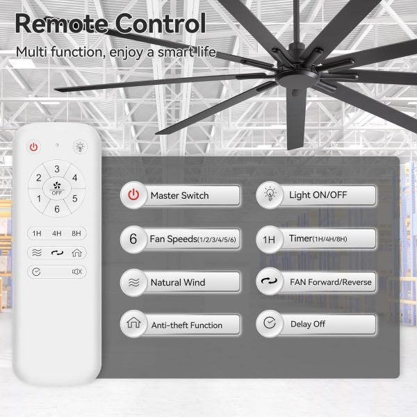 Multi-Function Remote Control: Control 6 fan speeds independently. Set a 1/4/8-hour timer with ease. The remote features silent key operation and is the only control option; wall switches are not supported