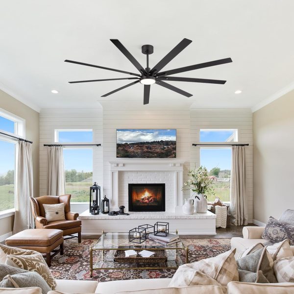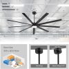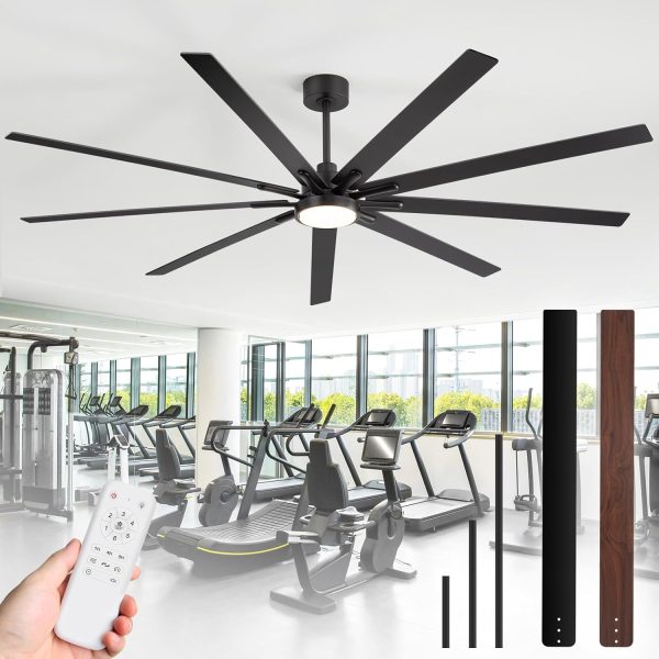 84 Inch Modern Industrial Ceiling Fan: This large fan features a sleek black body and 9 reversible plywood blades with a dual-finish design (Black + Wood Grain) for modern or rustic spaces. It includes 8", 12", and 24" downrods, fitting 13"C35" ceilings and supporting slopes up to 15. Its wide span delivers strong airflow, ideal for living rooms, libraries, garages, barns, or covered patios