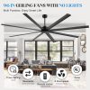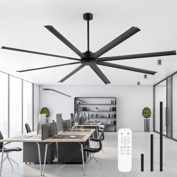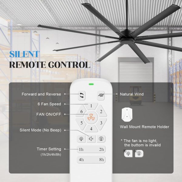 Large Black Ceiling Fans Remote Control This 96-inch large industrial ceiling fan with remote control. No need to leave your comfort; It's all at your fingertips! The fan's 6-speed settings, timer function, and motor reverse mode can all be effortlessly controlled via the included remote. Gain full control to meet all your needs.