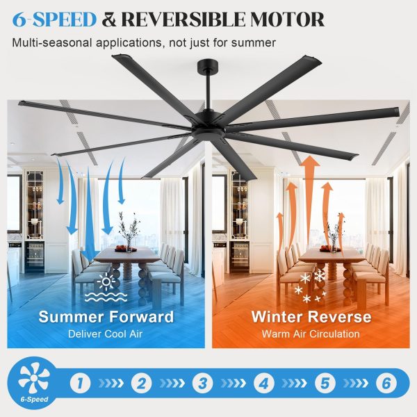 6-Speed Reversible DC Motor This 96" modern large ceiling fans with No Light is equipped with an ultra quiet dc motor. 6 wind speeds delivers airflow up to 12500 CFM. Reversible dc motor ceiling fan with light keep room cool with noise under 30dB. The reverse button on the remote control allows you to easily switch between downward mode and upward mode.