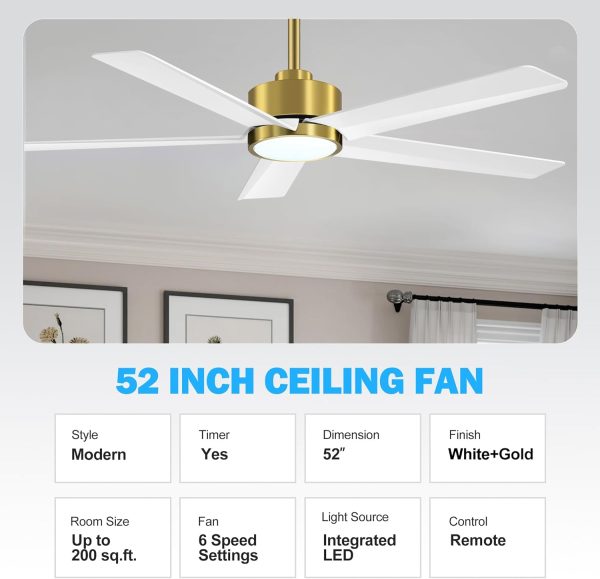 Modern White Ceiling Fan with Lights The gold-trimmed white 5-blade fan creates a fashionable and modern aesthetic. Our 52 inch 5 blades white ceiling fans are highly energy efficient, avoiding up to 80% of power loss compared to traditional fans. Ceiling fan damp-rated design, making it perfect for any room in your home or office – including bedroom, living room, office, kitchen, study room and covered patio, porch, gazebo and so on.