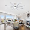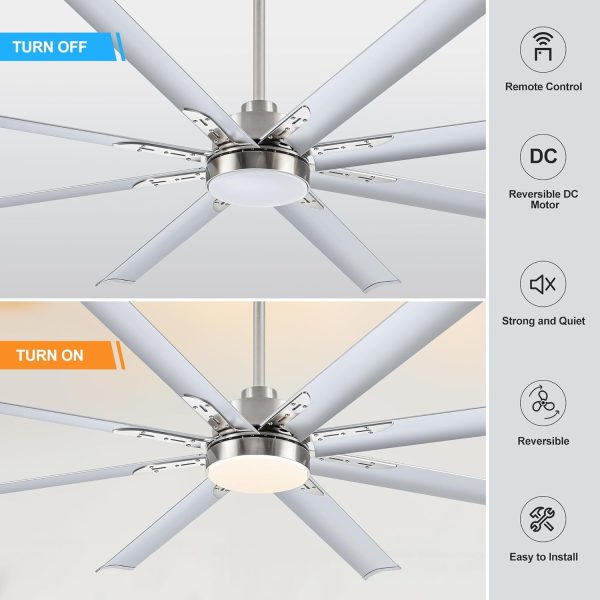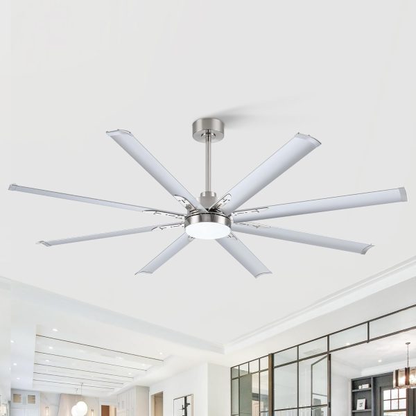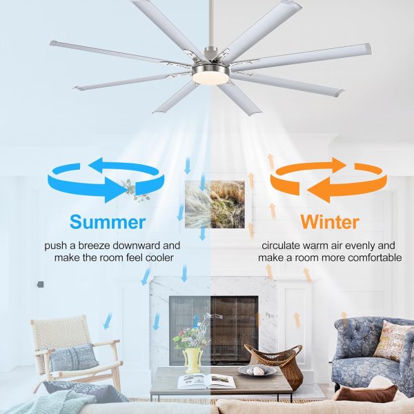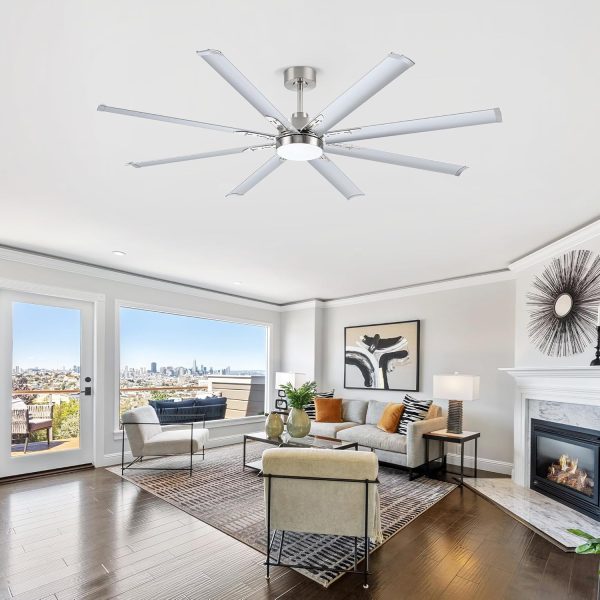 • Silvery Modern Ceiling Fan with Lights 72 inch large ceiling fan with lights, has the metal motor housing and 8 Aluminum Blades have a more modern look. acrylic cover with flicker-free LED light source can make the light more soft. The modern design style makes your room more stylish and upscale.(Suitable for living rooms, corridors, entrance passages, and covered outdoor patio)