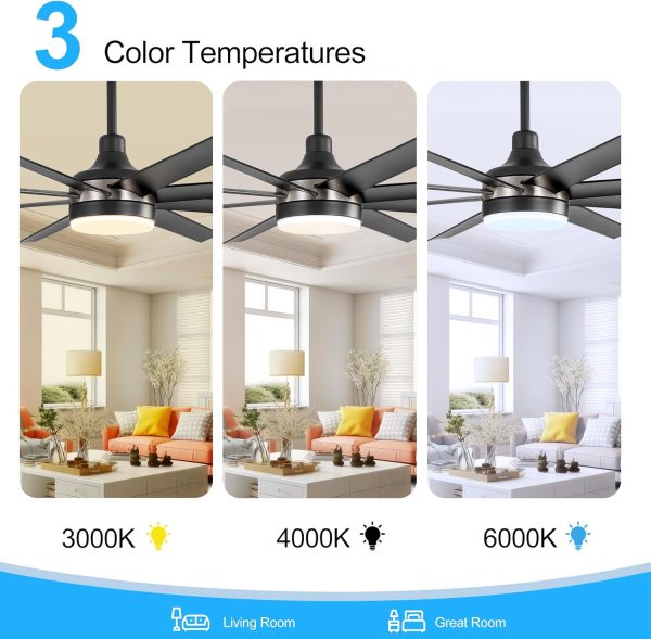 Large Ceiling Fans Remote Control: With the remote controller included, you can set the color temperature and the fan speed of this down rod mount ceiling fan with led light easily to a cozy mode. The fan and the light can be controlled separately. 6 speed gears and 3 color temperatures for choice(3000K, 4000K, 6000K). In addition, 1 Hour, 2 Hour and 4 Hour can be choosen when you use the timing function.
