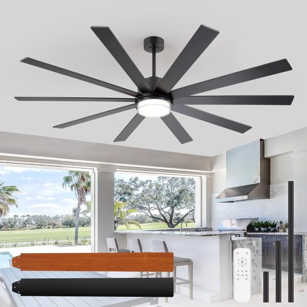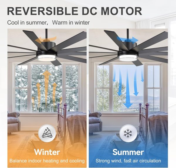 • Industrial Black Ceiling Fan with Led Light Upgrade your space with our 75-Inch large ceiling fan with light fixture, this large fan combines powerful performance with modern aesthetics. Featuring 10 durable plywood blades, it delivers optimal airflow while maintaining quiet operation. The reversible DC motor ensures energy efficiency, allowing you to enjoy comfort year-round.