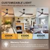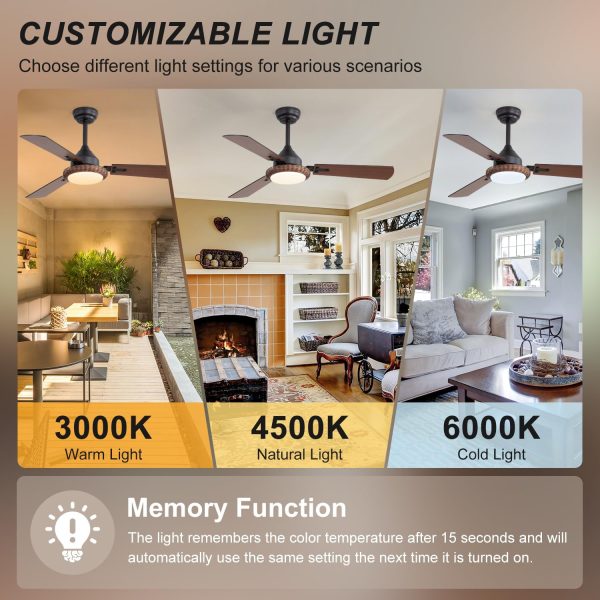 Adjustable LED Ceiling Fan Light This ceiling fan features an energy-efficient 18W LED light panel with adjustable color temperatures (3000K, 4500K, 6000K), allowing you to set the perfect lighting for any mood or task. The light memory function adds convenience by recalling your last setting